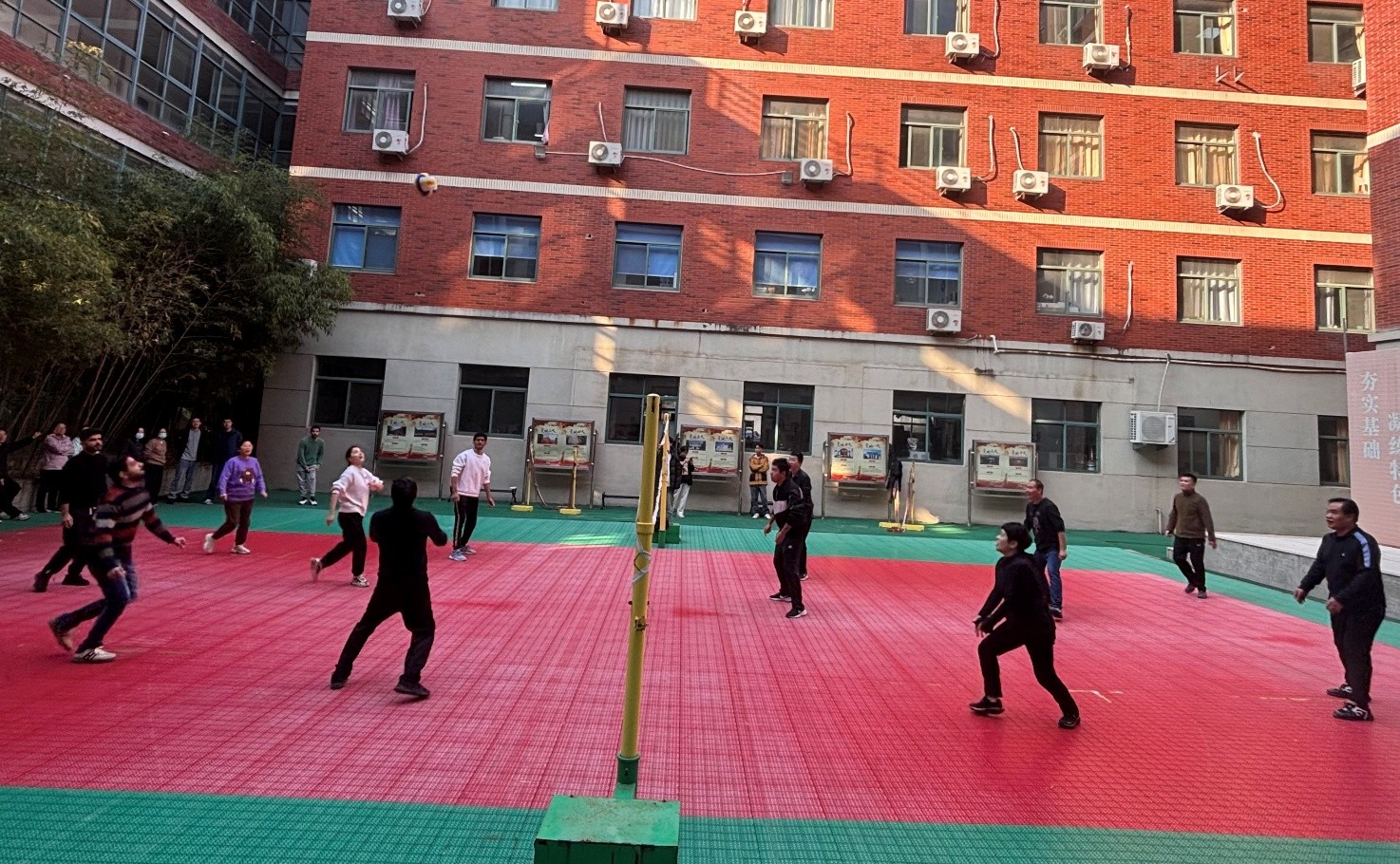 比赛采取三局两胜淘汰赛制,每局先得15分且领先对手至少2分者获胜。各参赛队伍精神饱满、配合默契,场上传球、扣杀、拦网等精彩瞬间不断,展现出我院教职工良好的体育素养和团队协作能力。场下观众热情高涨,加油声、欢呼声此起彼伏,现场气氛热烈活跃。多名外籍博士后踊跃参加,成为一道靓丽的风景线。经过多轮激烈角逐,最终化工队凭借出色的发挥荣获冠军,生工队、机关实验中心联队、应化队分获第二、三、四名。