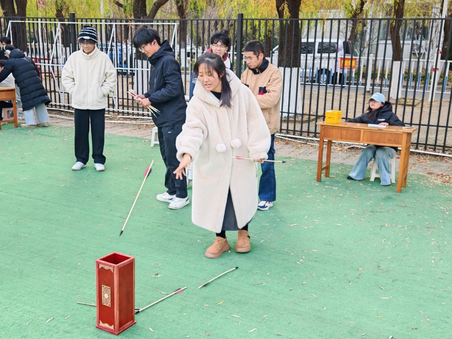 体育部与学生会志愿者通力协作,细致的解答与引导成功点燃了大家的参与热情。比赛设置了个人跳绳、趣味障碍赛、投壶和扔沙包等多项内容,既有竞技性又不失趣味性,既考验个人能力又增进同学交流。现场气氛热烈,参赛选手精神饱满,观众加油声此起彼伏,志愿者服务细致周到,整个操场洋溢着青春的热情与活力。