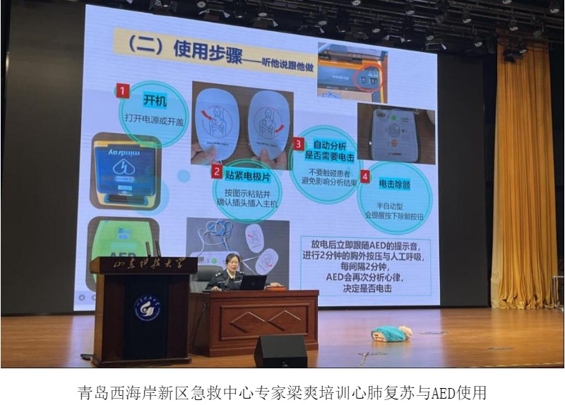 党委委员于昊教授聚焦实验室气体与气瓶安全管理核心,从气体物理化学危险特性、气瓶分类标识、安全使用全流程、风险识别管控及泄漏应急响应与个人防护等关键维度,进行了全面深入的系统性讲解,精准回应气瓶使用中的常见问题。青岛西海岸新区急救中心专家梁爽则针对实验场景中可能出现的心跳骤停等突发状况,开展心肺复苏(CPR)与自动体外除颤器(AED)使用专项培训,通过专业示范与要点拆解,为师生传授应急救治实用技能。两场高质量培训为后续演练与实操环节筑牢了坚实的理论基础。
