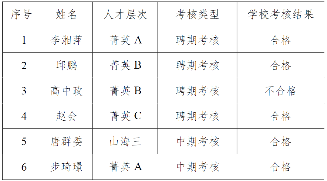 按照学校高层次人才考核有关文件规定,学校召开考核小组会议,对我院聘期考核、中期考核的高层次人才工作目标任务的完成情况进行考评。经学校考核工作小组评议,现将考核结果公示如下。如有异议,请在公示期内反映。
