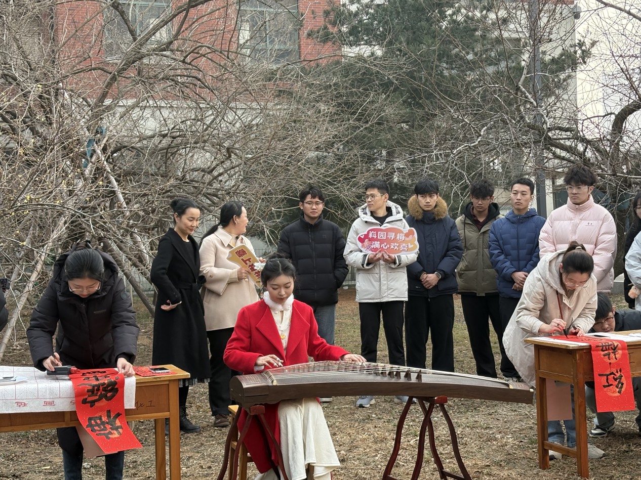 第三环节“梅花三弄和翰墨”则带来了视听双重盛宴。入党积极分子代表孟一诺现场用古筝弹奏乐曲《梅花三弄》,党员代表王甜甜、纪玉涵则同步挥毫,书写梅韵春联,现场众人凝神欣赏,传统文化在筝声墨香中浸润心田。曲终书成,掌声雷动。